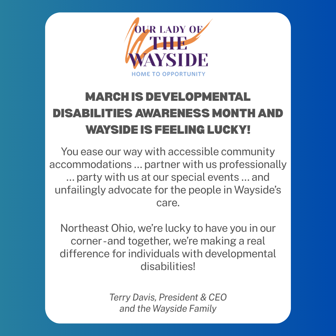 Our Lady of the Wayside provides Residential, Adult Day Programming, Transportation, and Healthcare Services for individuals with developmental disabilities throughout Northeast Ohio.